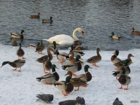 Я же перелистнул страничку, и увидел красивого лебедя на ней, который почему-то зимою не улетел в теплые края, а вокруг него, странно, но плавали еще утки.
